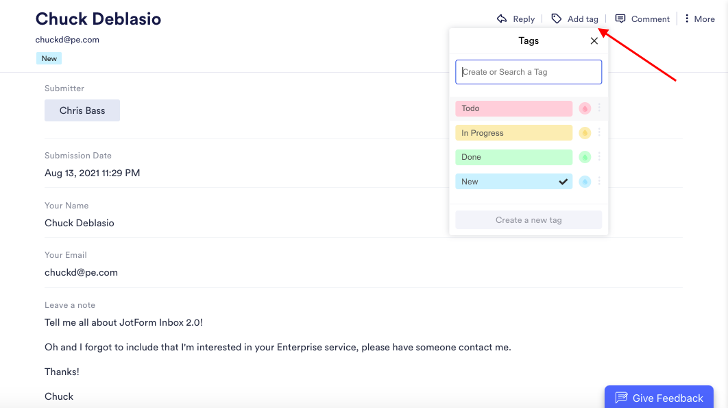Adding tags in Jotform Inbox 2.0 gives you and your team another way to categorize and more easily organize/identify groups of submissions. You can select one of the default tags or create your own tags to suit your team’s workflow.