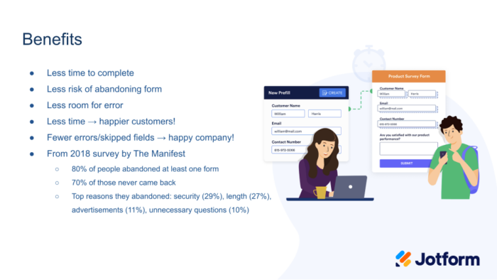Awesome. Thank you Art. Hi everybody, welcome. Thanks for joining us today. I wanted to kick off today’s session with some data about how people feel about filling out forms, and surveys say they don’t feel great about it overall. In this 2018 survey by the Manifest, they found that 80% of respondents reported walking away from a form and 70% of those said that their final action was to just not return. They entirely ditched form. So that’s about 56% of people saying that they entirely ditched form. The top reason was security. But when you look at the reasons that are related to how inconvenient the form was, for them, a combined 37% cited length or unnecessary questions as their reason for walking away. Of course, here at Jotform, we’re not going to tell you not to do forms, forms are essential in many quick cases, and important in unknown, almost all cases, nearly everything. But we do want to try to make it easier for you to get to that data. And it makes sense that offering to provide people with a prefilled form, even if it’s only partially filled out, will make it easier for them to increase the barrier that is keeping them from filling out the data. So it leads to happier customers, which can lead to higher conversion rates for you.