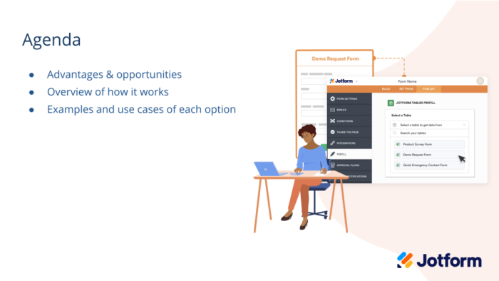 The next example is Jotform as the data source. Before I go into some of the best practices for this one, really, these are two ways of approaching the same option. So if you’re not familiar with Tables, whenever you create a form and start getting data, Jotform automatically pulls that data into a table, it looks like a spreadsheet. Each column is one of the questions on your form. And each row is somebody’s response. So all of the data is stored there. But we know that not everybody uses tables. And so we wanted to make sure that wasn’t a barrier to easily getting to your data. So whether you’re used to using Tables, or you’re just using forms, these will both connect you to data that you’ve already collected in Jotform. So one of the highlights is that you already have your data here, within Jotform, you don’t need to go elsewhere for it, you can easily transfer data from one form to another, or even you’ll pull it into the same form and resend that, for me. This is a great option for sending to the same person or a group of people. I know just from hosting webinars, one of the major use cases I’ve seen for prefill. Over the past couple of months, as I’ve been doing this, people ask if there’s a way to easily transfer data if you’re asking a customer to fill out the same information a couple of different times. This is really a great option for that. So if you have a starter pack where they have to fill out three forms, and you’re asking for names on all three, you can pull that in, so they don’t have to worry about that.