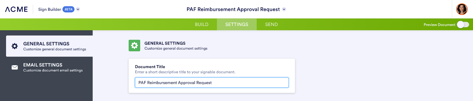 Editing the name of an e-signature document is simple. From the Settings tab, simply click into the document title field displayed in the General Settings to make changes.
