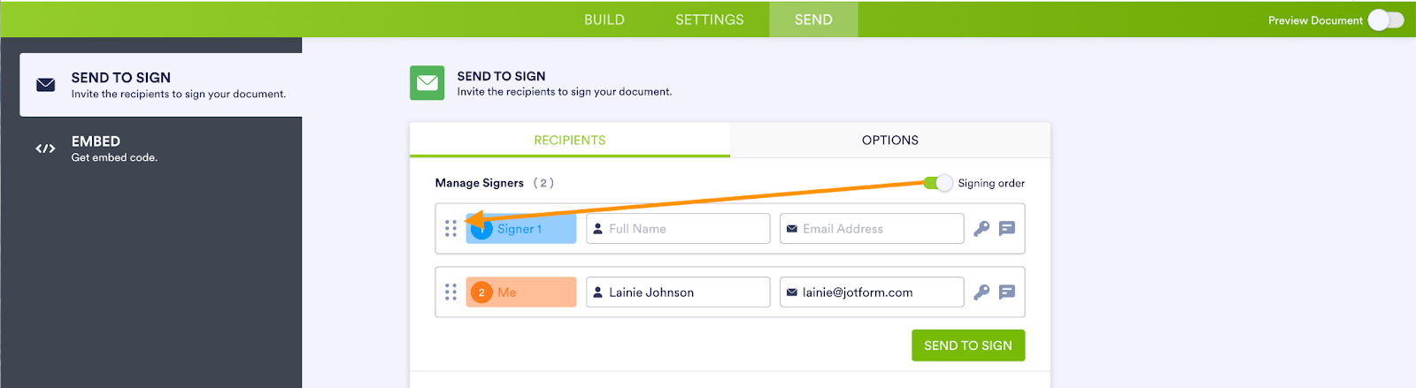 Click the Signing order toggle switch to dictate a specific order for signature collection. To adjust the order, simply drag the listed signer to the desired signing position.