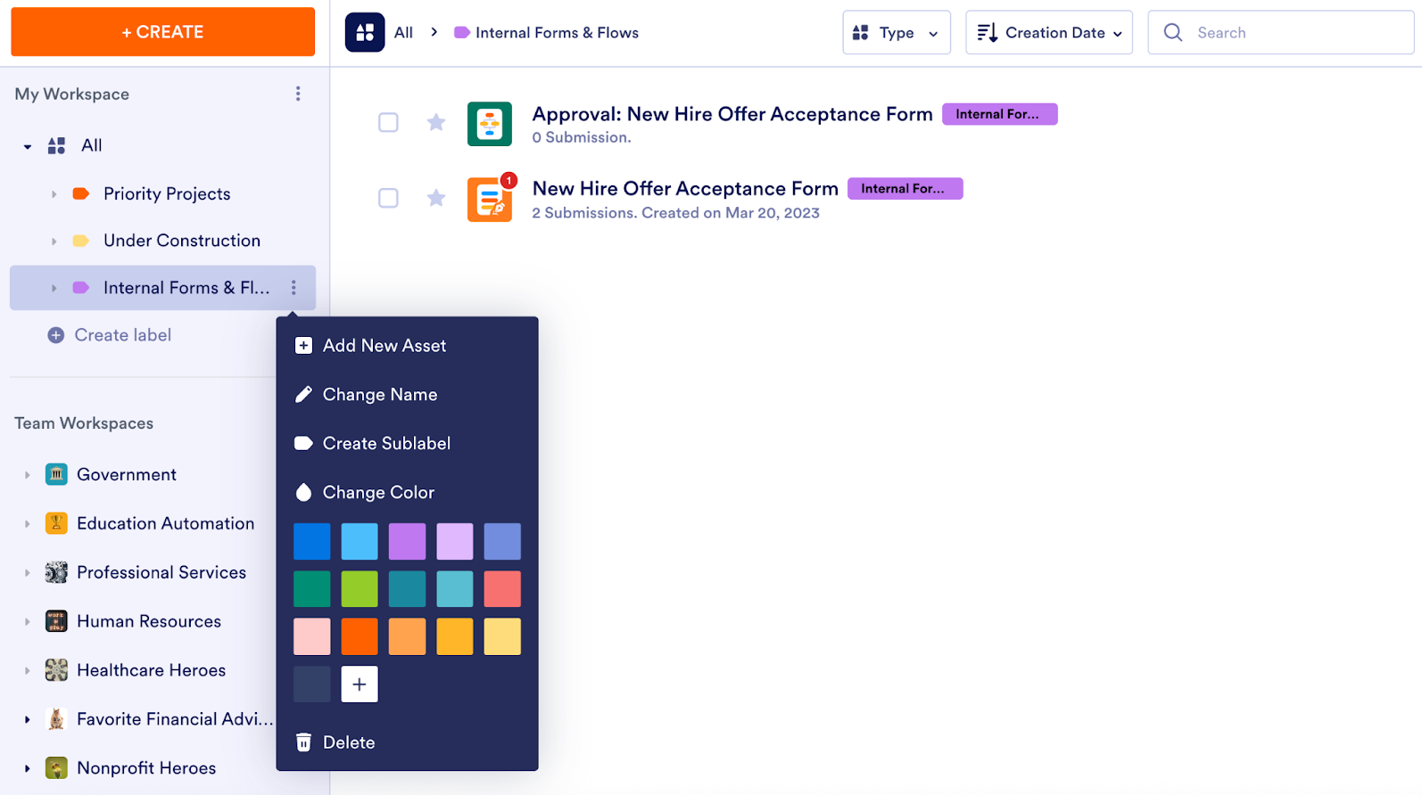 The launch of My Workspace made it possible to see all your assets (forms, AI Agents, workflows, apps, e-sign documents, etc.) in one place — and filter them by asset type. Now the labels feature gives you the power to view related assets of various types in one place, enhancing visibility and organization.