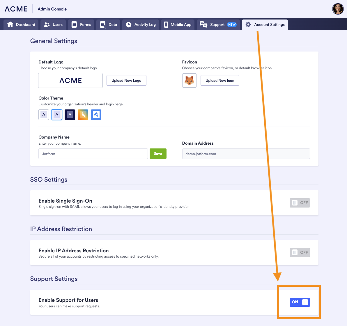 Support is open to all users as a default. Admins have the option to disable support for their users by navigating to the Account Settings tab and scrolling down to the heading at the bottom of the page called Support Settings. From there, use the toggle switch to enable or disable requests for your users.