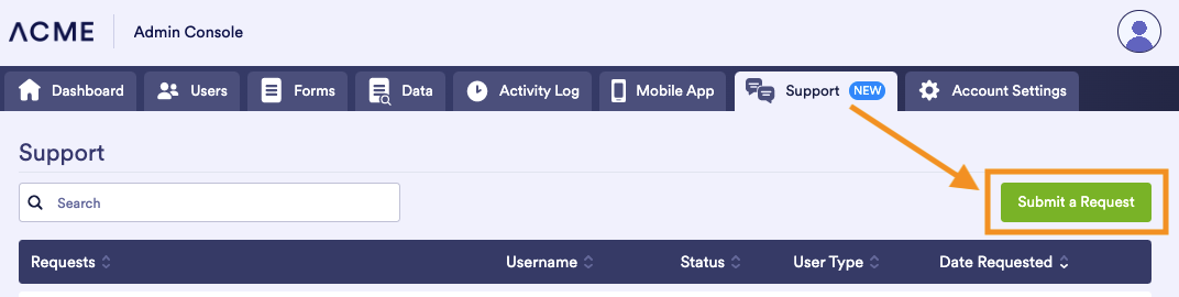 If you’re an admin, you can also access the system directly from the Admin Console by clicking the new Support tab. To submit a new ticket, click the Submit a Request button.