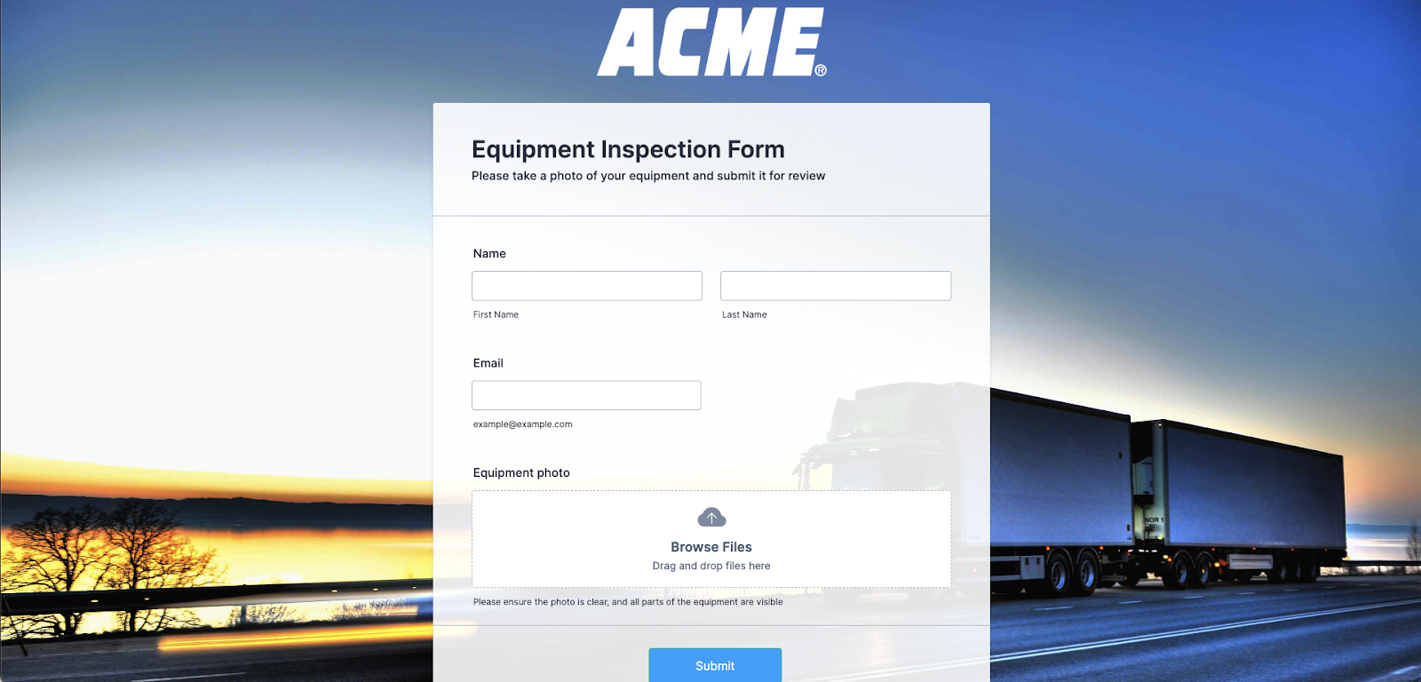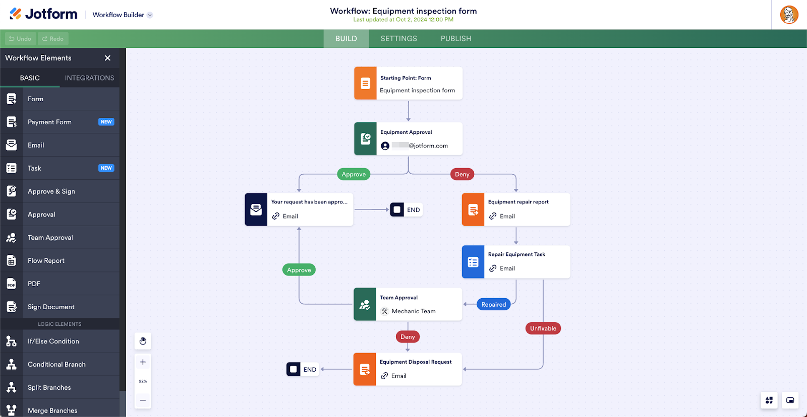 This workflow starts with an equipment inspection form, which employees fill out and submit. Using white labeling, our example organization has completely customized the form’s logo, colors, and style — no Jotform branding in sight.