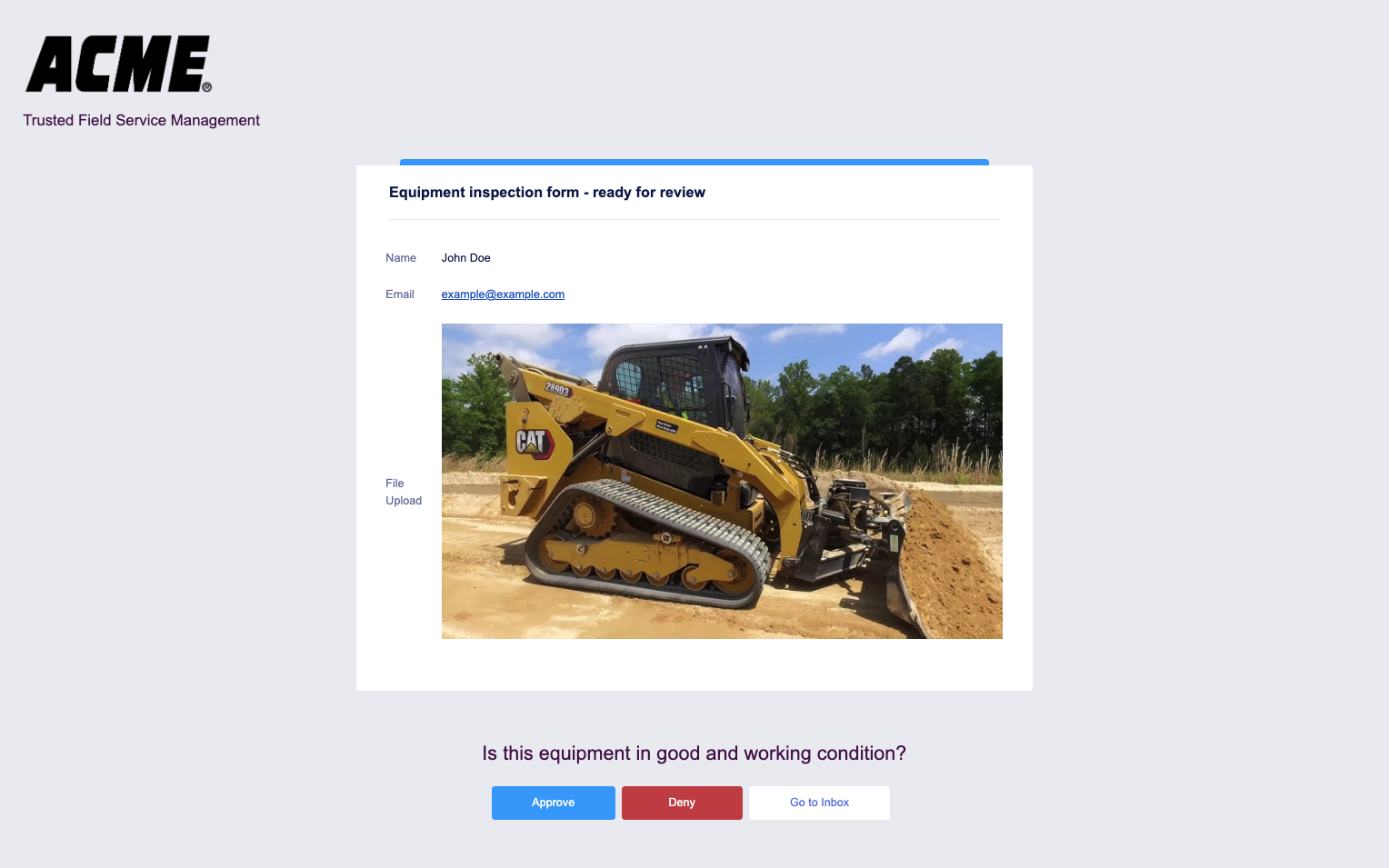 Submissions to this form are automatically routed to a senior manager to decide if the equipment is in working condition or not. With white labeling, we can fully customize the approval request email that is sent to the manager.