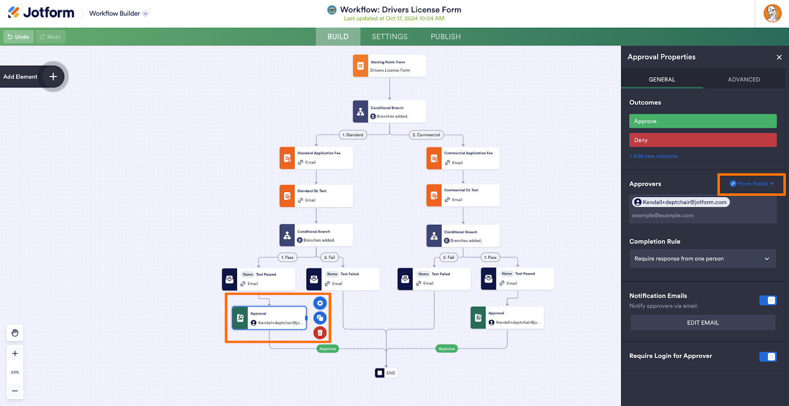 If the applicant passes, they receive an email with their test results, and an approval request is sent to the DMV to confirm the applicant can receive their license. You can edit the approval request options in the Settings of the Approval element. You’ll be able to set the approval outcomes, add any completion rules you want, and edit the notification email. Add approvers or prefill them using the Form Field dropdown menu.