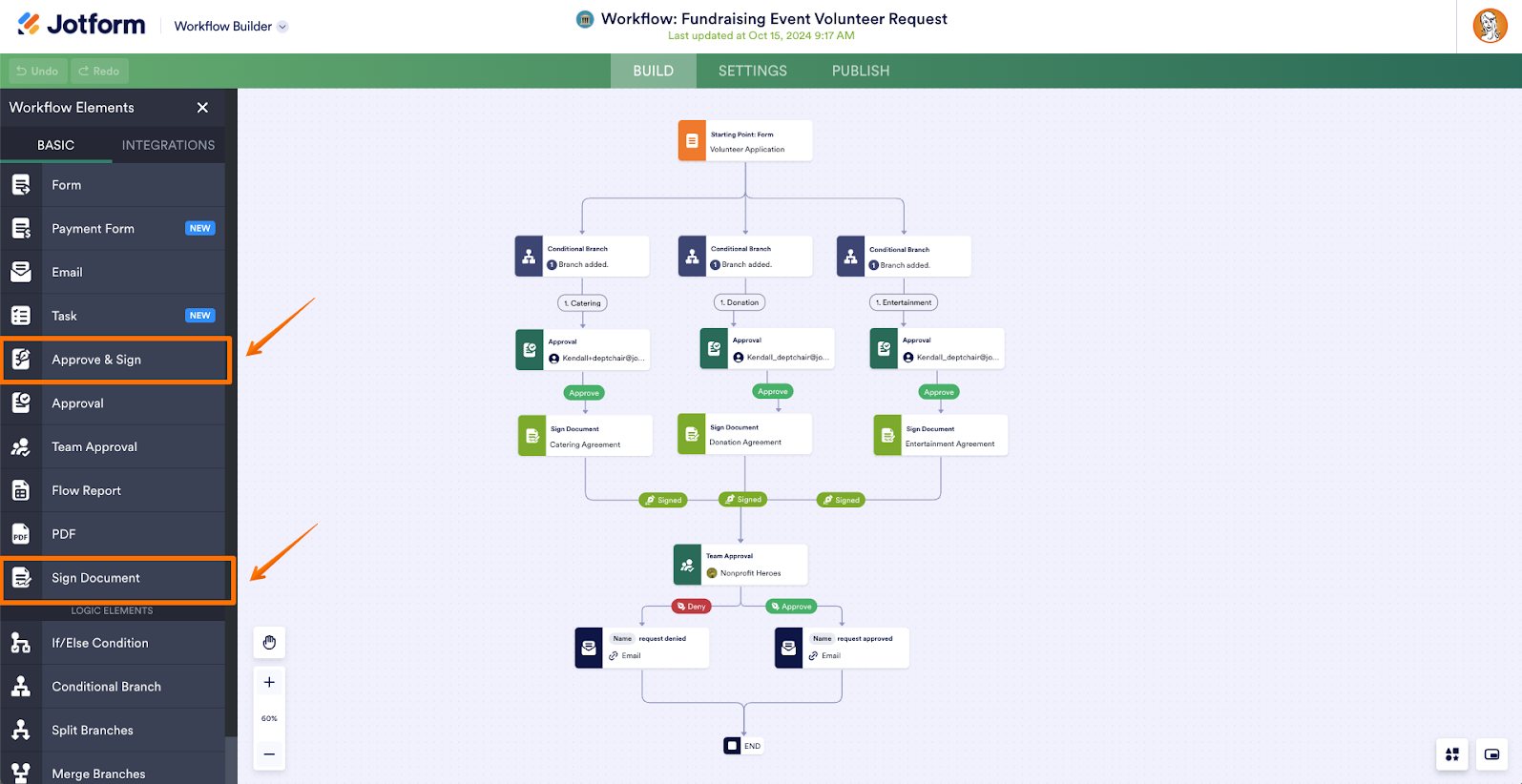 If the application is approved, the volunteer is sent a catering agreement to e-sign. To add an agreement to a workflow, drag and drop the Sign Document element into your workflow and choose the appropriate document.