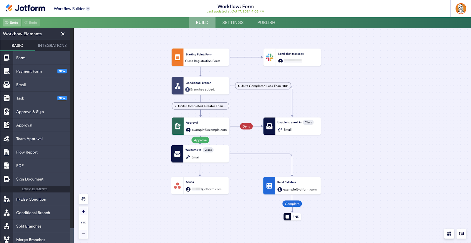 Creating a workflow is simple. Navigate to Settings in the Form Builder, select Create Workflow, and start by dragging elements from the left side of the page onto your canvas.