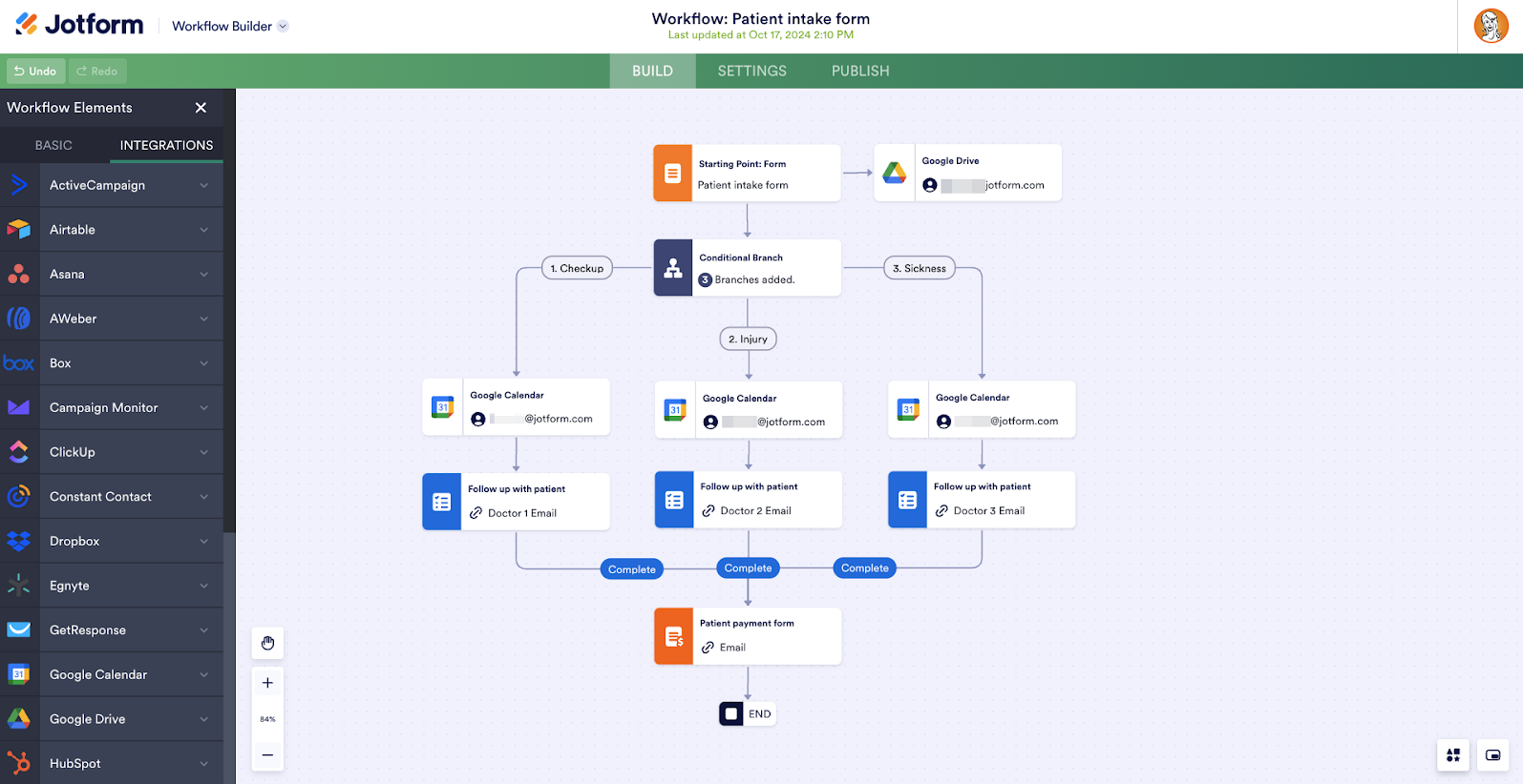Moving down our workflow, the patient intake form connects to three different conditional logic branches. These paths use the Google Calendar integration to schedule doctor appointments with three different doctors. Patients who request a checkup are automatically prompted to schedule with Doctor 1. Patients with injuries are scheduled with Doctor 2, and sick patients are scheduled with Doctor 3.