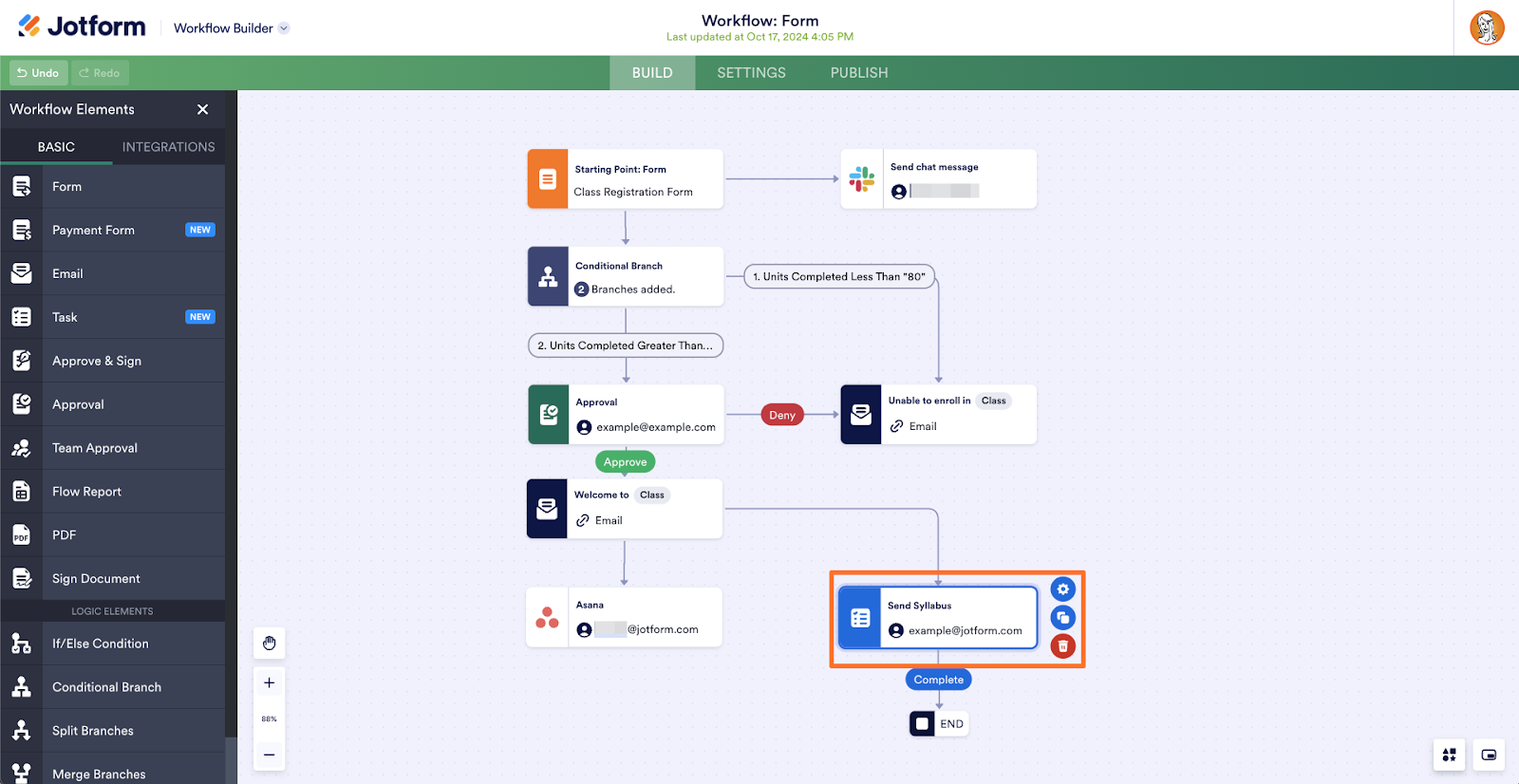 The final branch of this workflow is a Jotform Workflows task assigned to the professor, also reminding them to send the student an introduction and syllabus. Having this task in both Asana and Jotform will help ensure that each student is welcomed to the class and sent the appropriate materials.