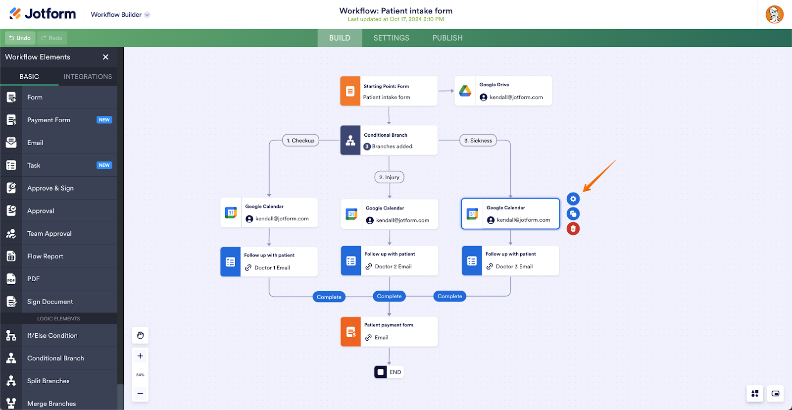 Next, we’ll set up a scheduling automation with Google Calendar. Drag the Google Calendar integration into your workflow and connect it to one of the conditional logic branches (i.e. checkup, injury, or sickness). Next, click on the integration, and then click the gear icon to enter the integration settings. Here, you can connect to the appropriate doctor’s Google Calendar for appointment scheduling.