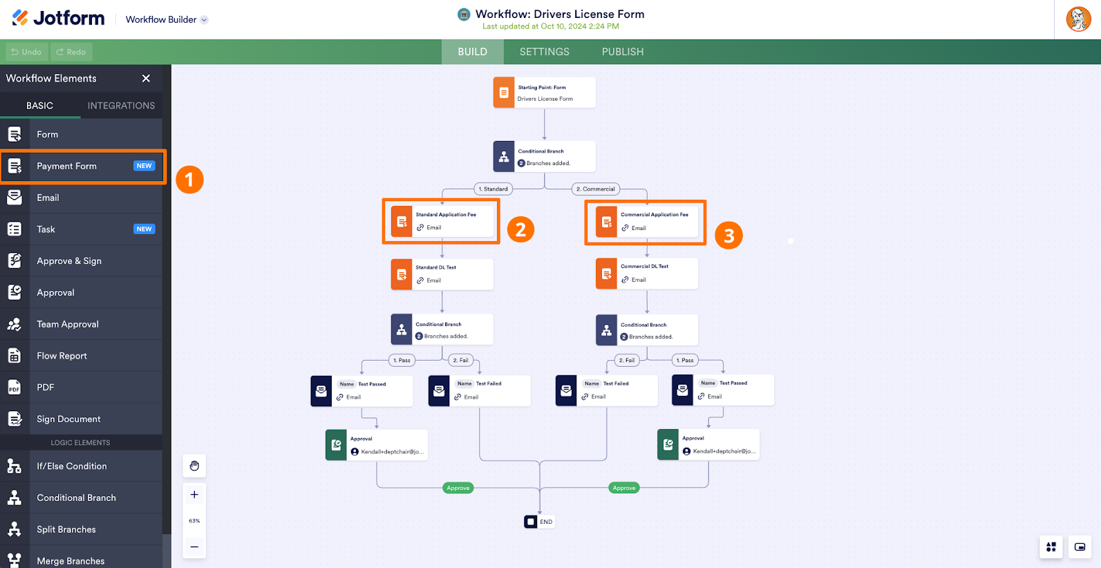 Next, a Conditional Branch element will route the applicant depending on whether they selected a standard license or a commercial license. These branches then lead to two separate application fee payment forms, as the payment amount differs depending on which license type the person is applying for.