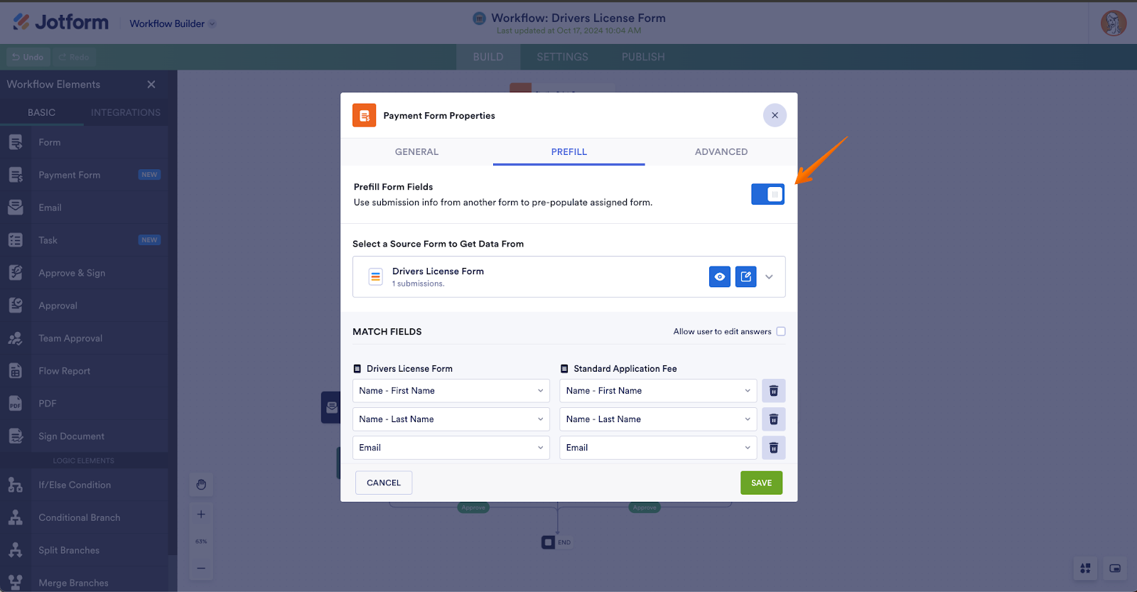 Next, the workflow can automatically pull the information from the original license request form into each payment form, so the user doesn’t have to fill in their information twice. To set this up, we’ll select the gear icon to open the Settings screen for each payment form. Then, we’ll toggle on the Prefill Form Fields setting in the Prefill tab.