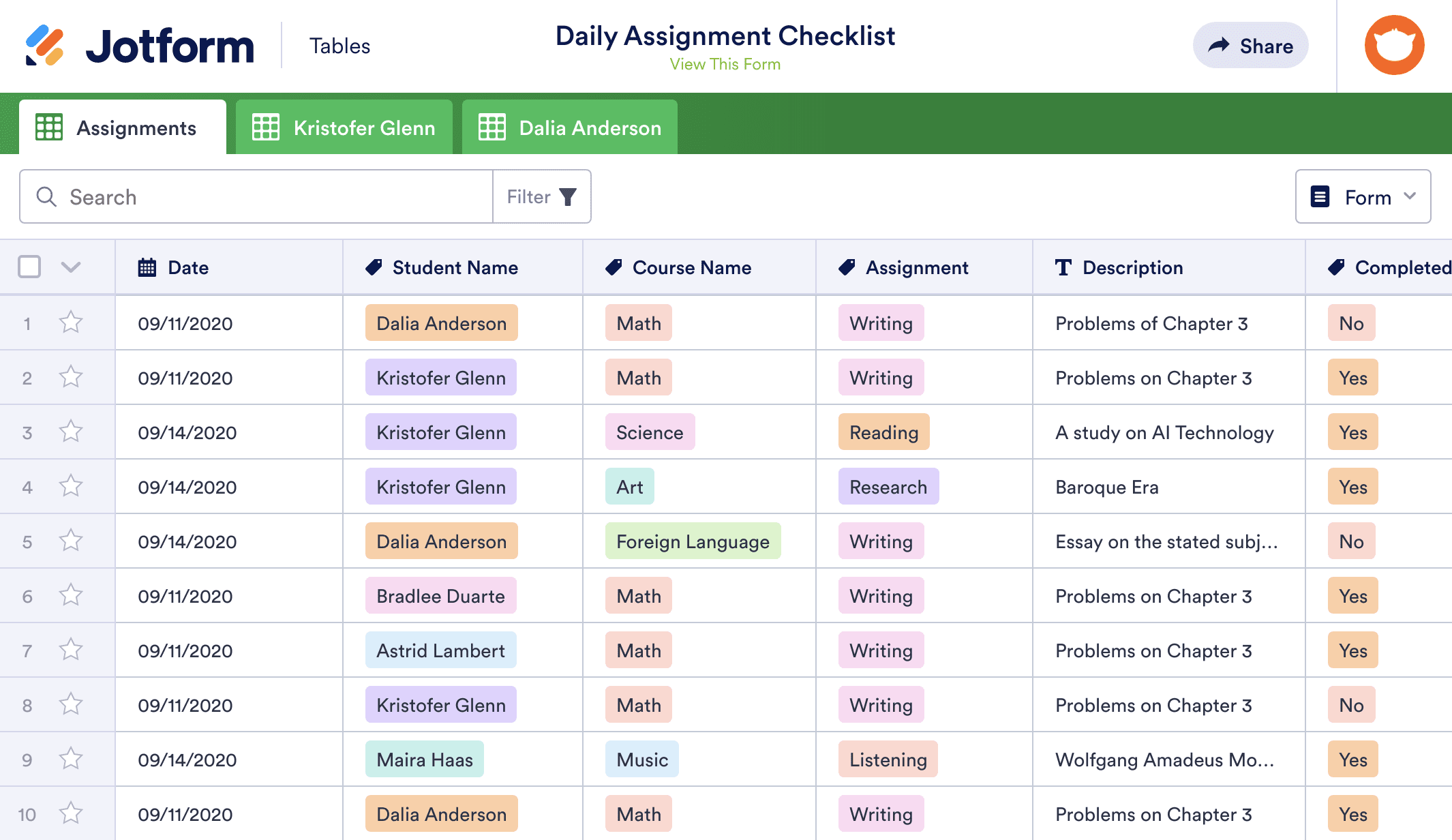 Teachers can use online forms and databases to monitor and collect assignments from students. Rather than having them print out work or even email it to the teacher, students can use online forms to submit tasks in a standardized way.