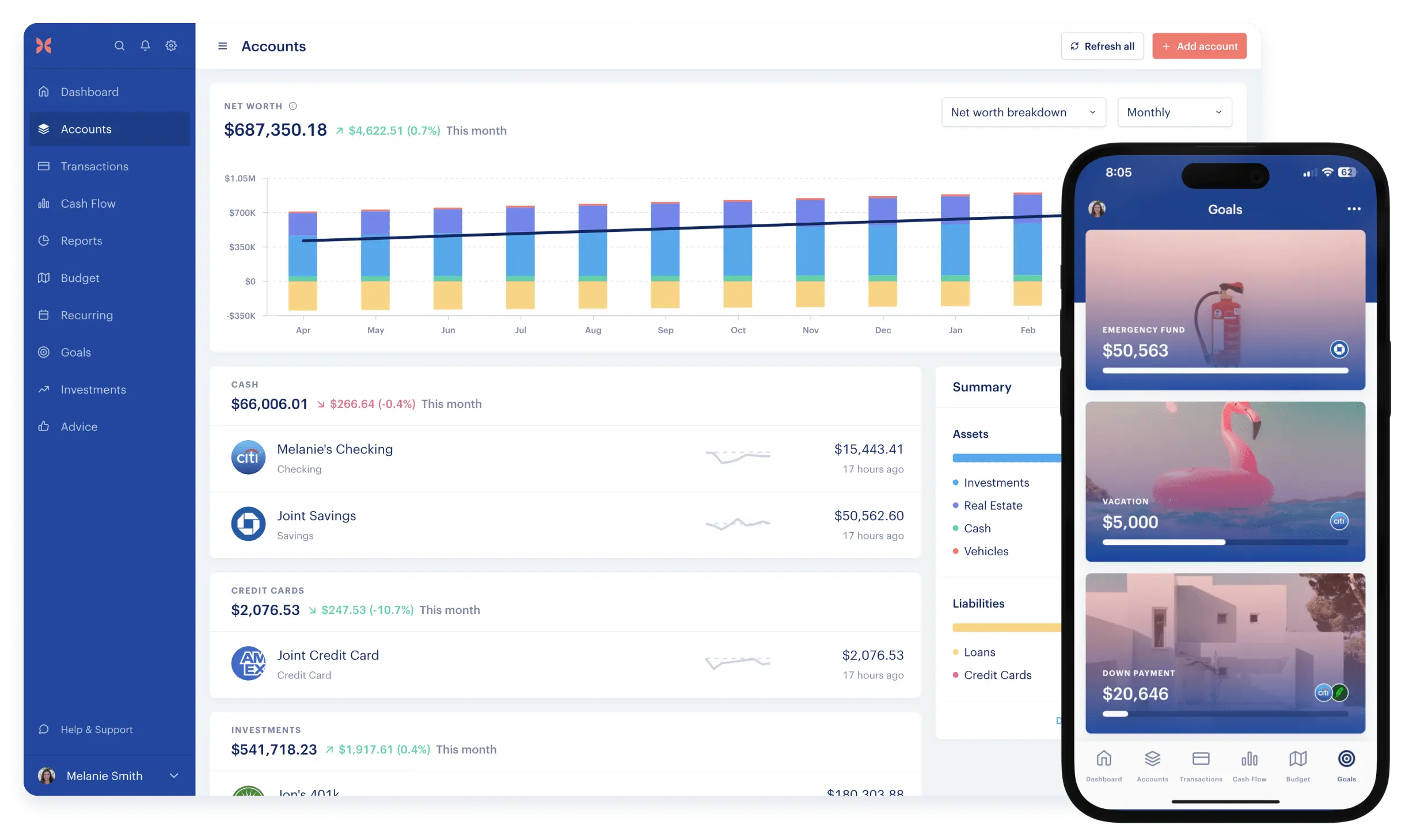 Monarch provides a holistic view of your finances, tracking all your assets and transactions in one place. Users can create budgets with customizable categories, set and track goals, and view their spending in charts and graphics. Dashboards offer users a comprehensive view of their money, with personalization options and drag-and-drop widgets. Monarch also lets you add a partner to your plan for free.