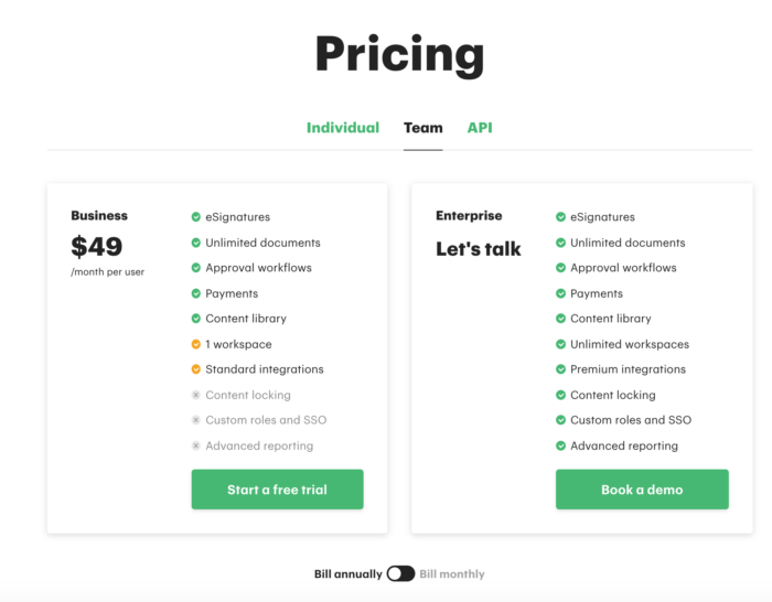 Their standard plans range from $15 to $35 per user per month. Contact a sales representative for enterprise pricing.