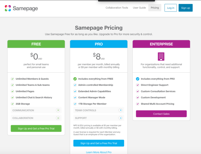 Unlike many other solutions, Samepage has a free version. They aim to be the all-in-one place for teams to work together. Features include team chat, video conferencing, screen sharing, task management, document management, and many more. Samepage integrates with hundreds of third-party apps.