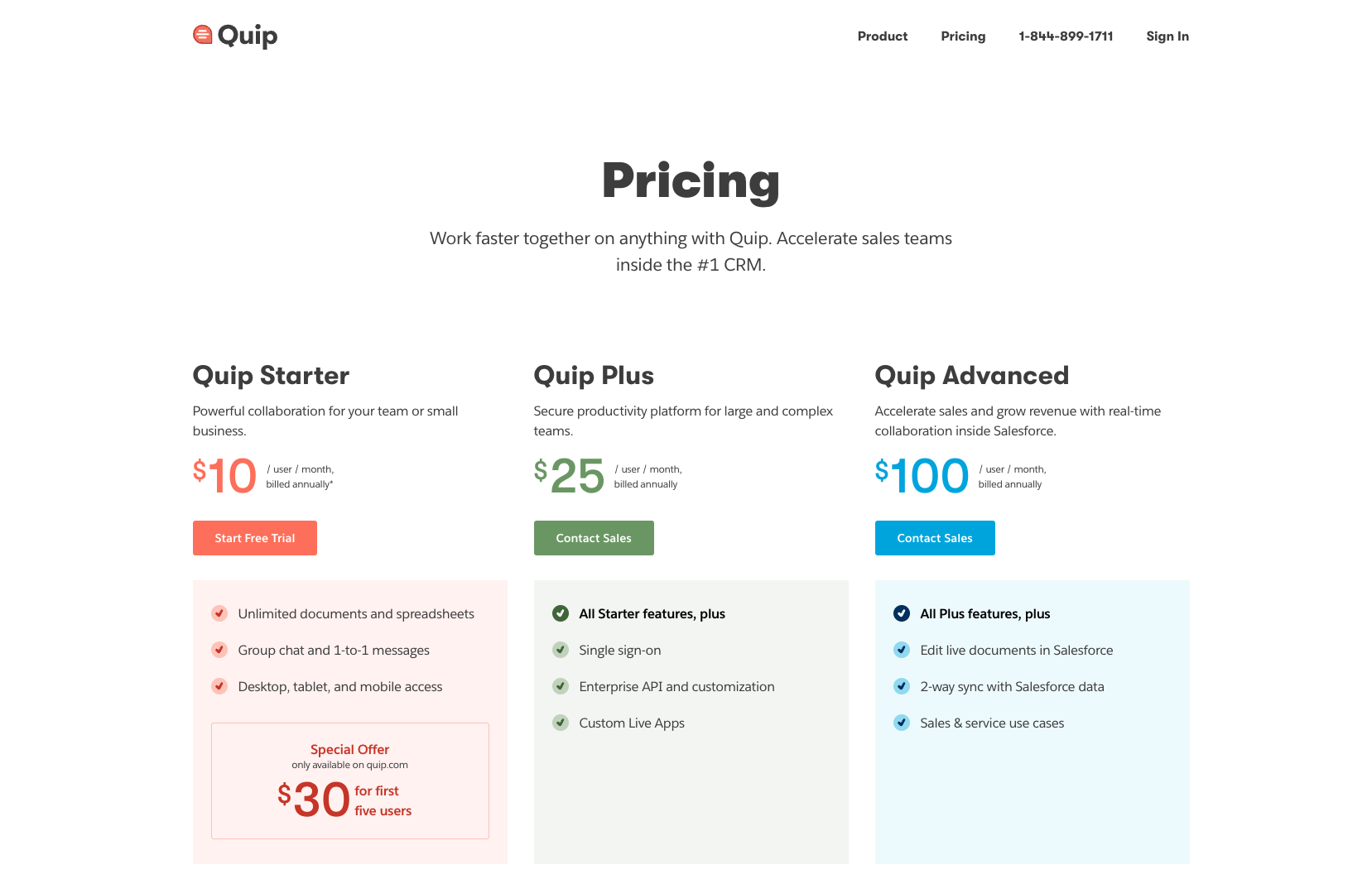 There are three plans available to choose from: a Quip Starter plan for $10, Quip Plus for $25 per month, and Quip Advanced for $100 per month.
