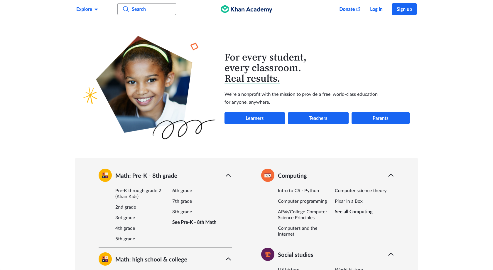 Khan Academy is like a cheat code for teachers, providing tools to assist with delivering great educational content. It provides carefully curated learning materials for students of all ages, and their courses are gamified, making them more engaging. Their math courses are especially excellent and helpful.