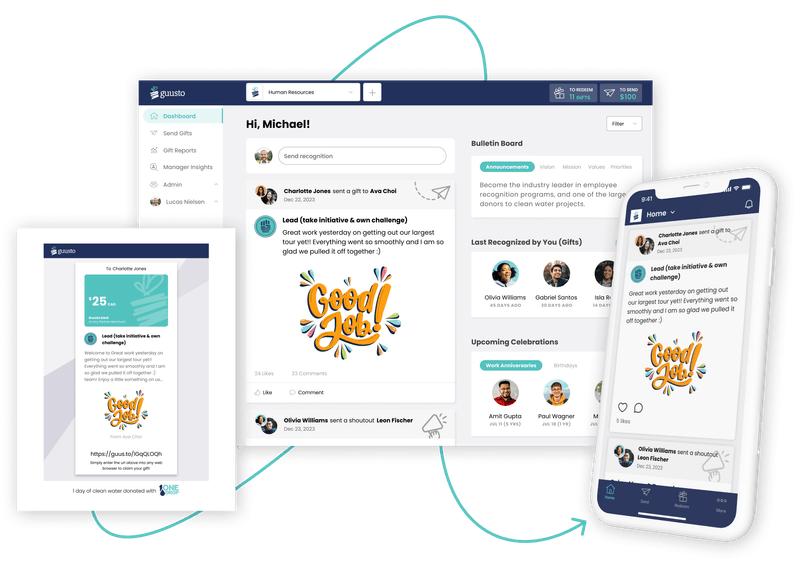 Along with features like milestone awards, years-of-service recognition, real-time recognition, and peer-to-peer mentions, Guusto makes a donation to the One Drop Foundation for every gift users send within the platform. This lets users also make a social impact through their hard work.