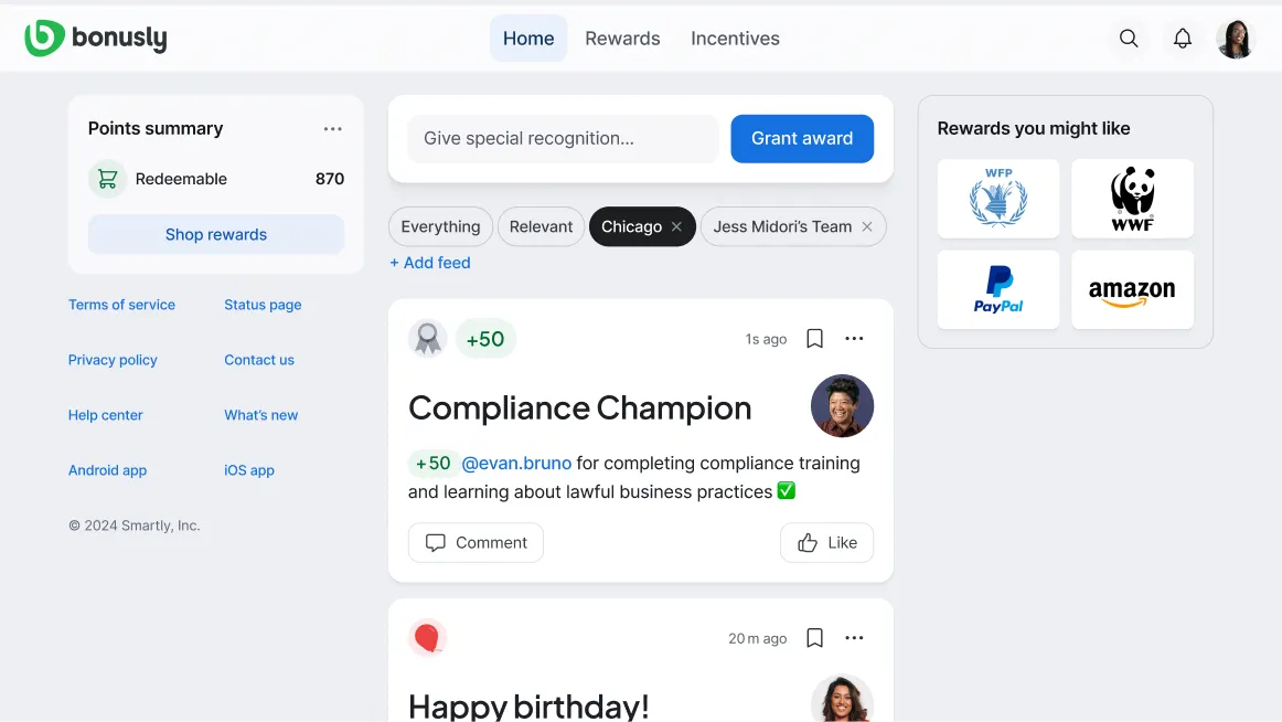 Notifications of a reward show the recipient what they did to earn recognition and how many points they’ve received. The rewards system shows employees how many points they need to collect rewards, and you can automate reward delivery. For example, when an employee gets 100 points, they automatically get an Amazon gift card.