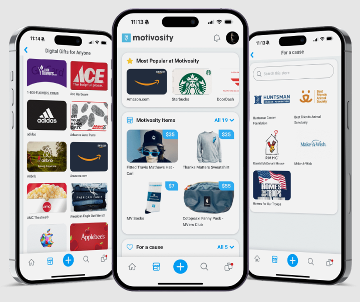 Motivosity gives employees and managers the ability to publicly recognize team members using a social media portal-like interface. Motivosity uses unique features that motivate employees to recognize their peers’ achievements by allocating “influence currency” (in-application currency) that they can spend by rewarding it to their colleagues within a designated period. Managers can also choose to use a ThanksMatters card, which is a Visa gift card that has money added to it each time an employee receives recognition from their peers or management. Employees can redeem this card at the retail outlet of their choice.