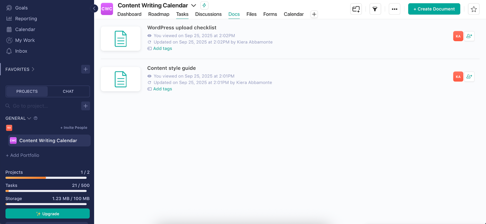 Nifty’s ambition is to be the only project management tool you need — and it makes a strong case for that. I was impressed by how it integrates different aspects of a project into one view, including tasks, project roadmaps, discussions, and even docs and files.
