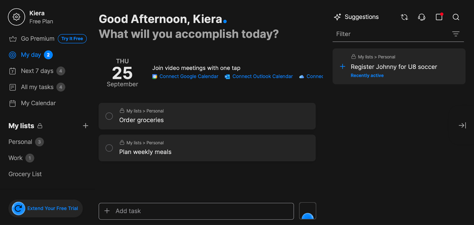 I particularly love the My Day feature: It offers a list of suggested tasks on the right, and you can add them to your daily to-do list with just a click.