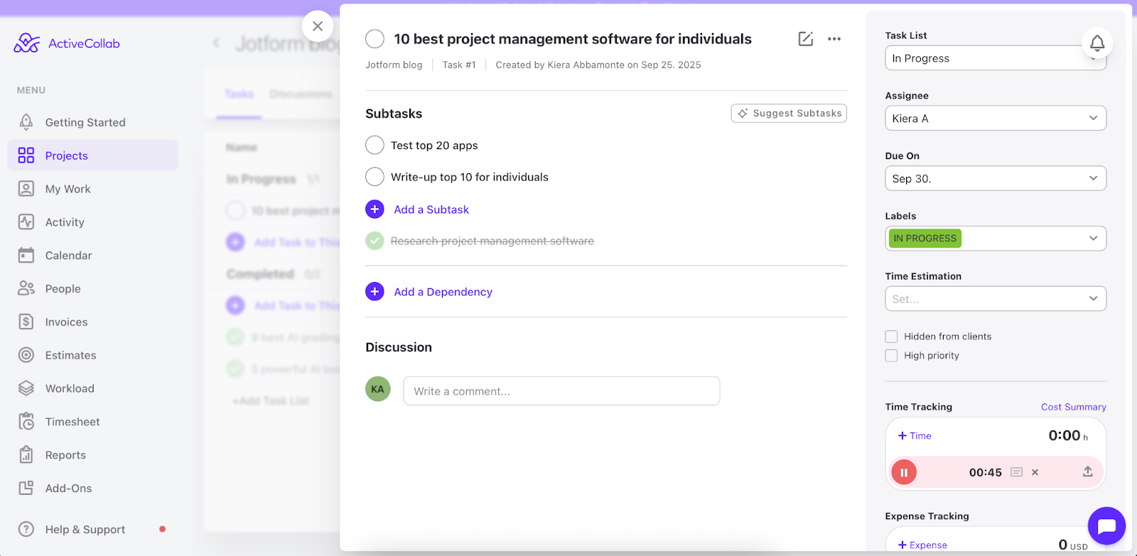 - Time tracking: For freelancers or anyone tracking time spent on a specific goal, a built-in time tracker provides valuable insight into where your hours are actually going, which helps you plan, quote, and bill projects.