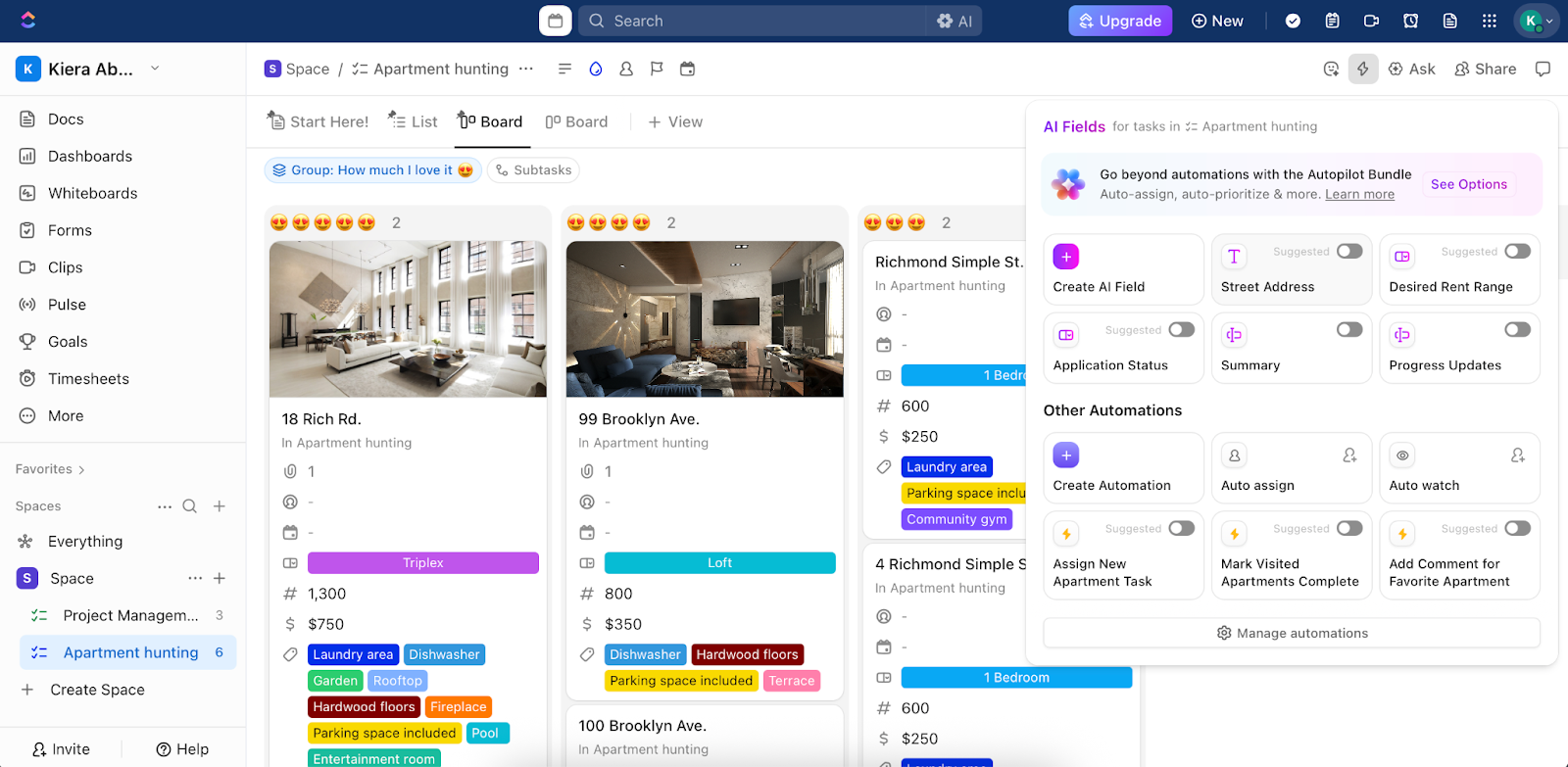 Plus, ClickUp offers a number of useful AI features that are even available (in a limited way) on the robust free plan. You can ask the chatbot — called ClickUp Brain — which open tasks have the highest priority or to find tasks that are stuck, as just two examples. Or you can add AI-powered custom fields to your tasks.