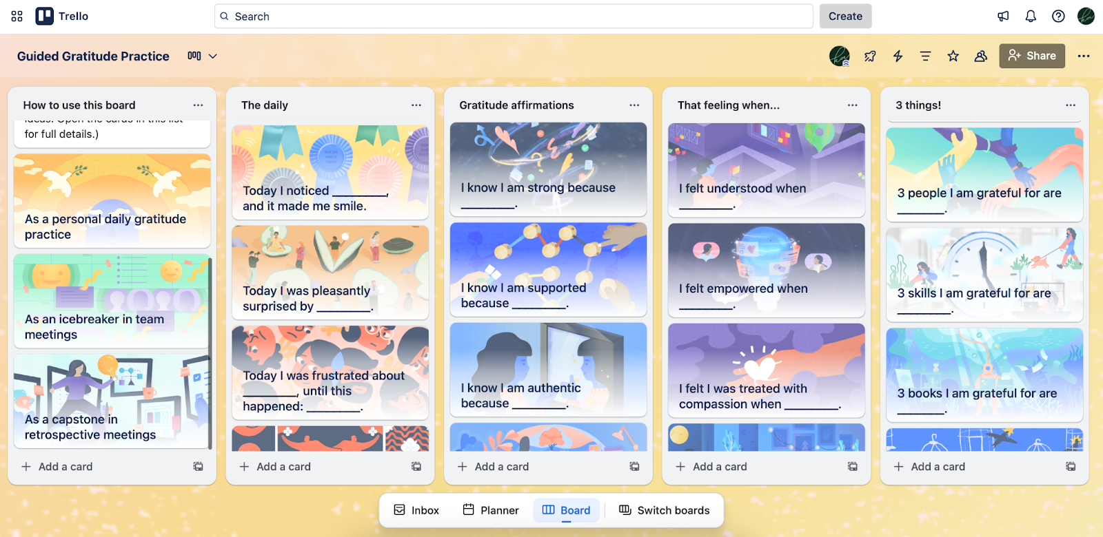 You create a board, add lists for your workflow stages (e.g., To Do, Doing, Done), then add cards for each task. The newly added Inbox feature makes it easy to dump and triage tasks; then you can schedule everything out in the Planner tab.