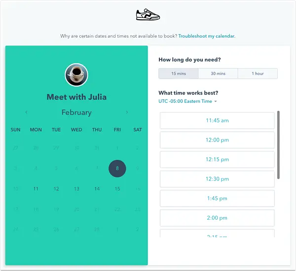 The app’s user-friendly interface makes it easy to set availability, send meeting invites, and automate reminders. With its integration with HubSpot’s all-in-one tools, you can ensure that all your scheduling data is synced and accessible. HubSpot’s tools all provide a free suite option. Whether you’re a solopreneur or have a small team, HubSpot’s meeting scheduler is the scheduling app is an accessible and affordable option.
