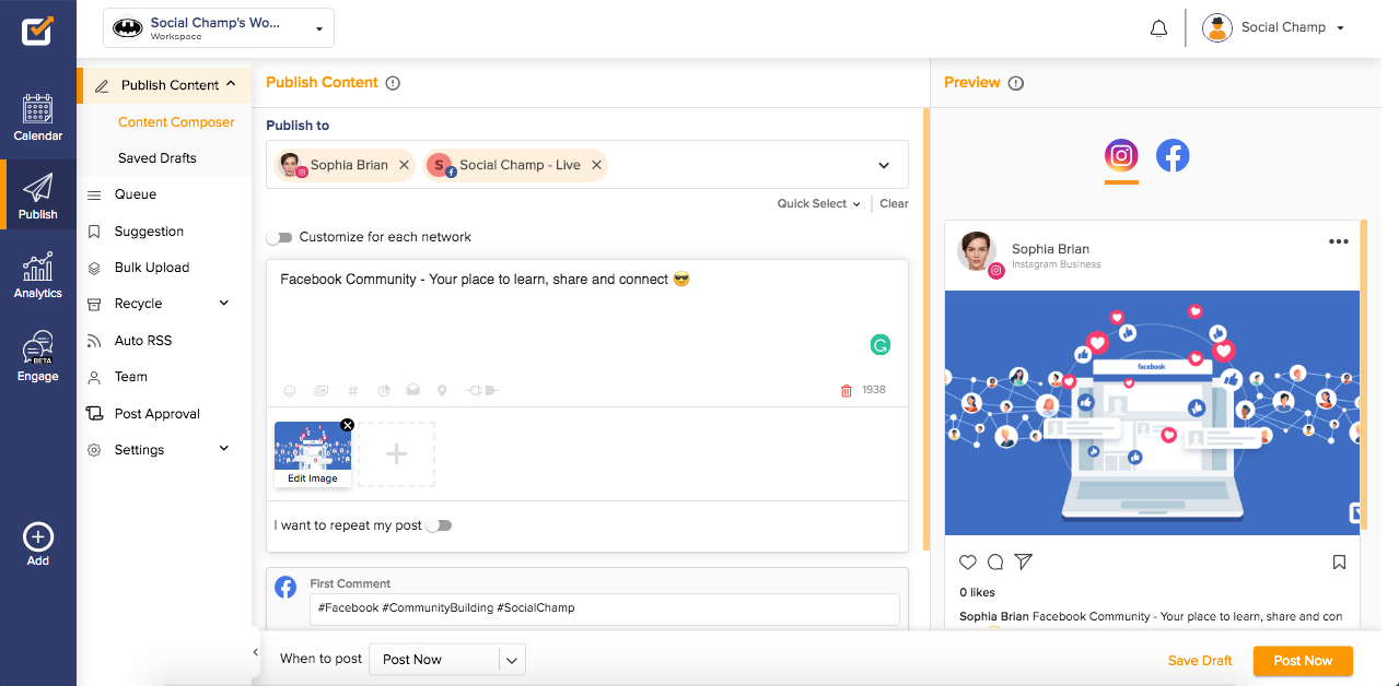 Social Champ is a social media marketing tool for small businesses that can help you schedule regular updates on your social media channels as well as curate blog content. Social Champ can also monitor your feeds for specific keywords to find users who are championing your brand.