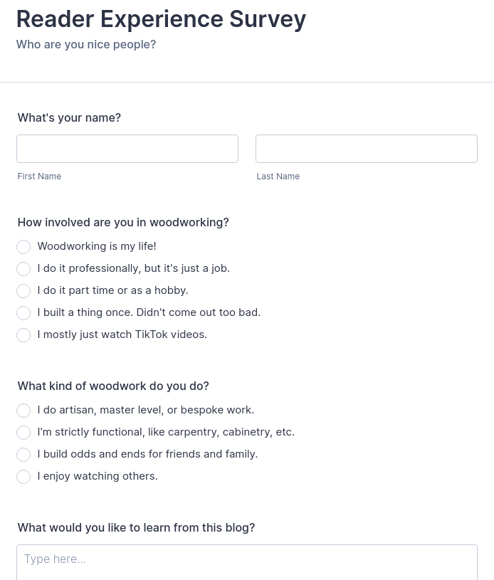 You can add a satisfaction form to your blog to learn what your readers really think about it. Think of this as a way to fine-tune your offering. Try to avoid asking direct questions like, “Did you like the post on setting up the lathe?” That won’t give you much information. Instead, ask your readers for feedback that can help you gently steer your blog in the right direction.