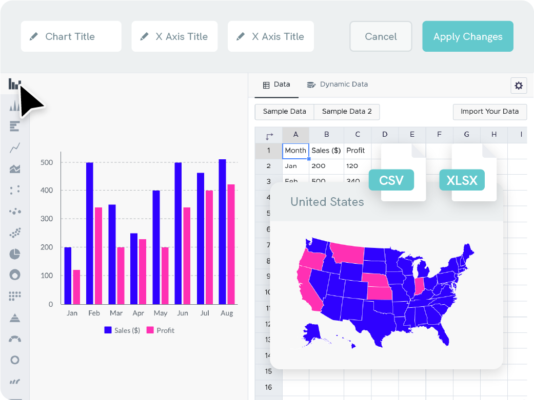 - Powerful data visualization can pull data from Google Sheets, Microsoft Excel, and more.