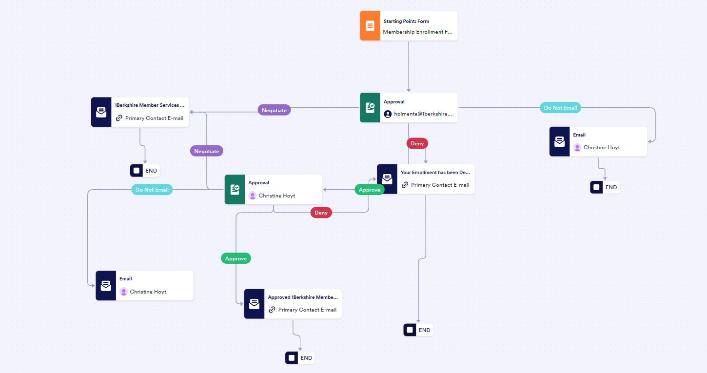 As an organization funded in large part by membership dues, 1Berkshire needs to be able to process new member applications in a timely manner. Delays can cause people to abandon the application altogether.