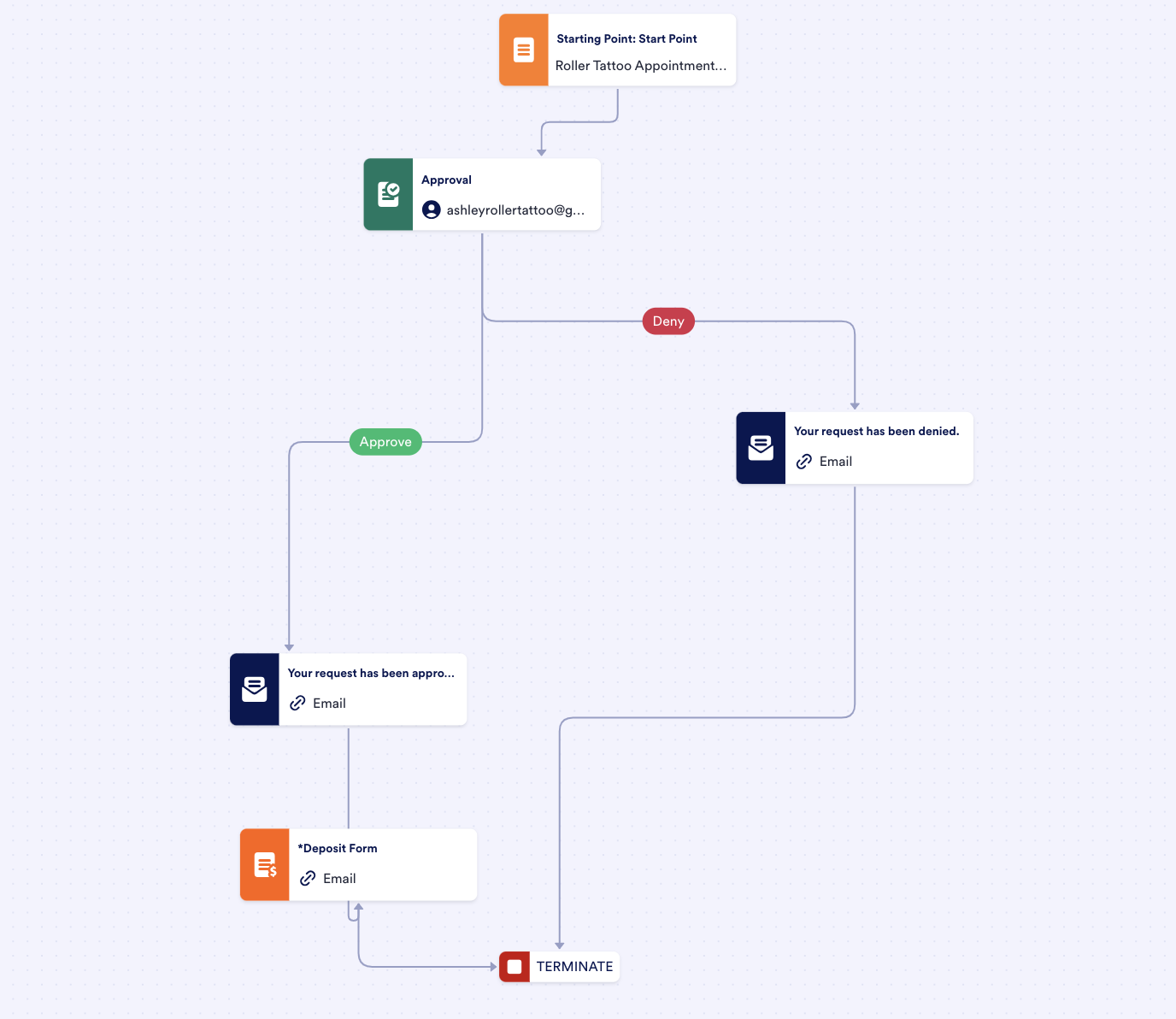 Here’s what Roller’s workflow looks like. It’s simple, but it gets a lot done. The appointment form is at the top, followed by an approval element that Roller can approve or deny. If approved, the deposit form is automatically sent to the client who filled out the appointment form. Notification emails are automatically sent as the workflow moves along.