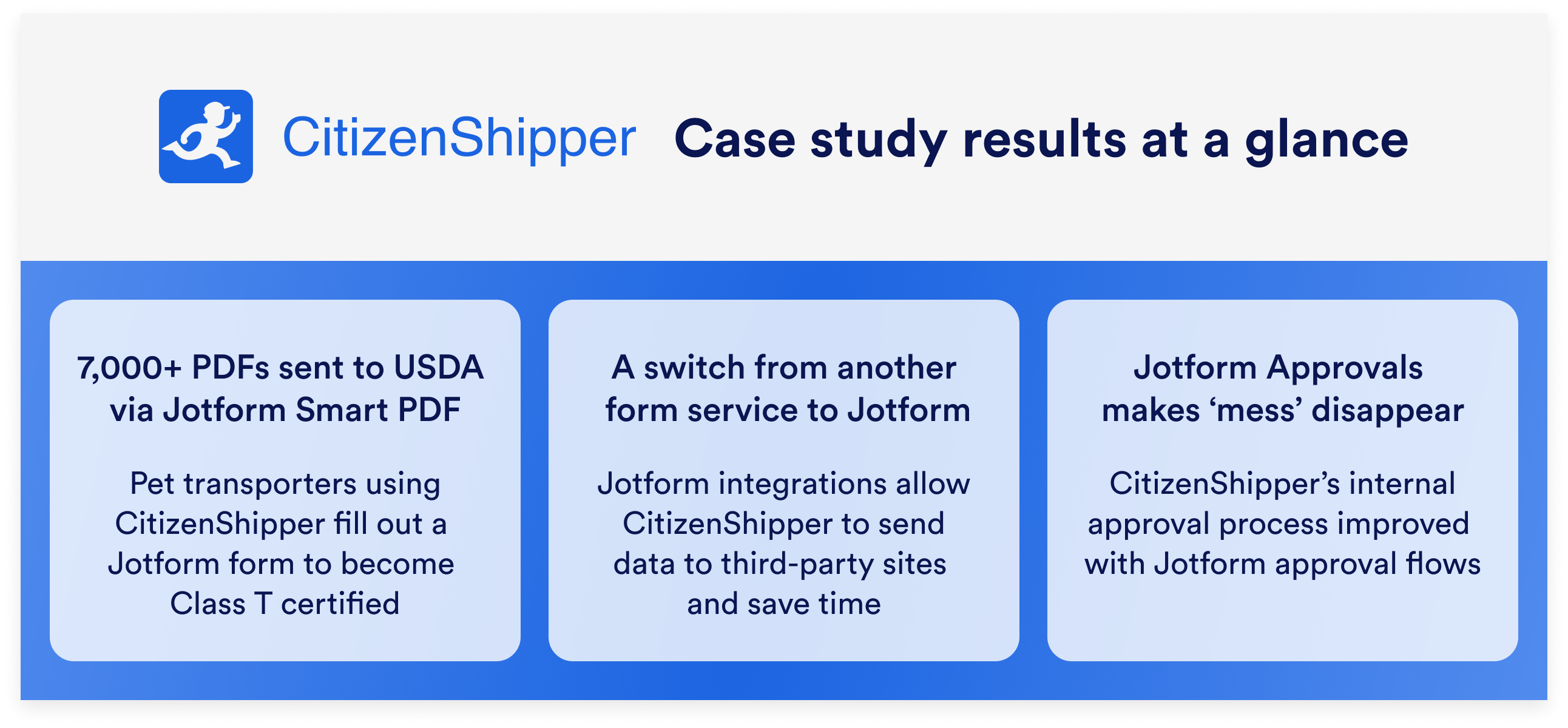 That’s when CitizenShipper turned to Jotform. Jotform’s Smart PDF Forms provide mobile-friendly online forms that are automatically converted back into PDF files once the form is submitted. Thus far, more than 7,000 PDFs (and counting) generated by Jotform have been sent to the USDA by CitizenShipper.
