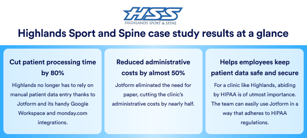 Once Highlands implemented Jotform into its workflows, employees noticed how much time they could save on administrative tasks. In fact, Weimer credits Jotform with reducing the time spent processing patients by close to 80 percent.