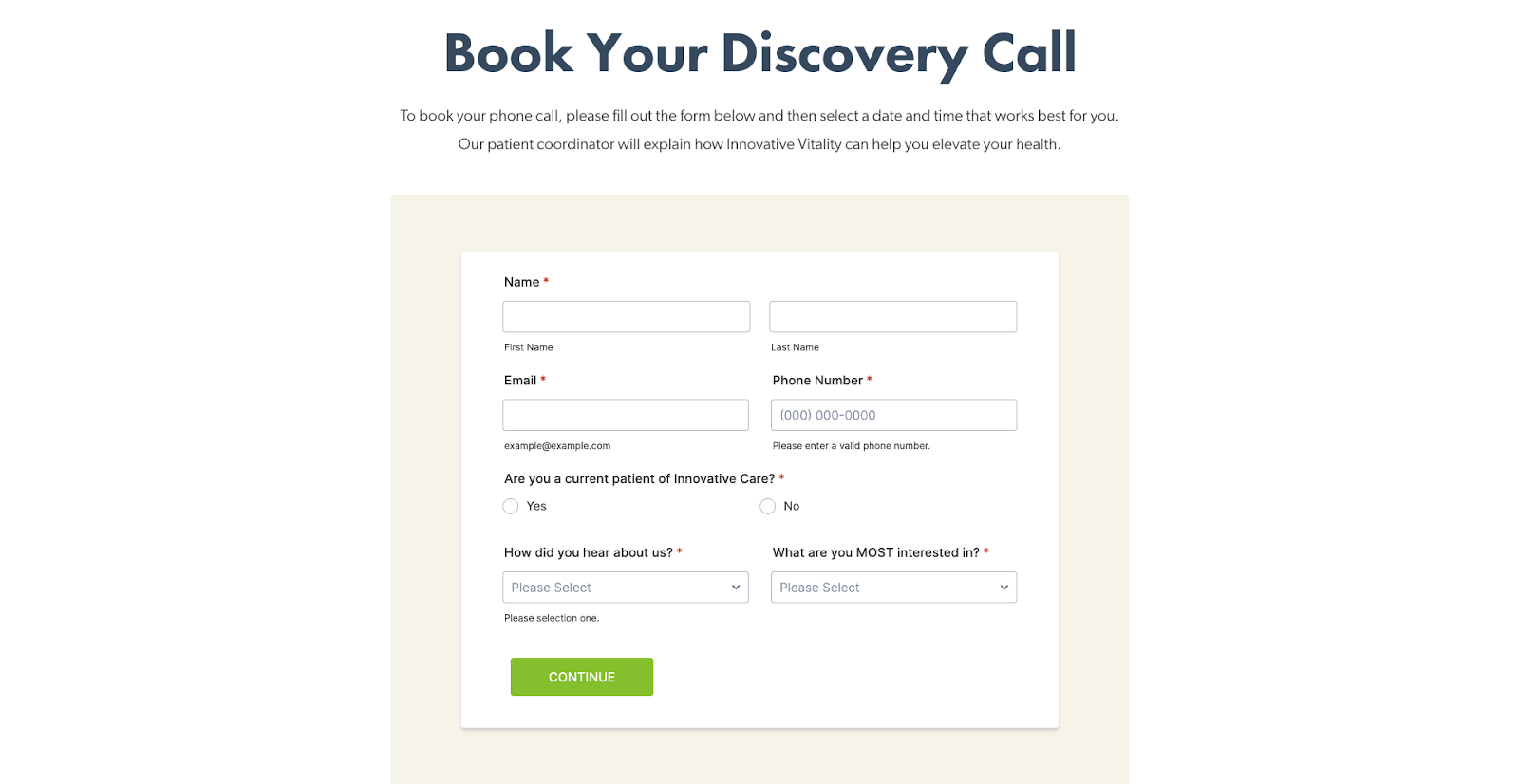 Whenever possible, Innovative Care allows patients to book appointments immediately online. But as a concierge-like practice, it also uses an intake form that allows patients to indicate what kind of care they are seeking and book a discovery call with an intake coordinator. For some practice areas, the team uses an intake form to collect information like past diagnoses, as in the case of its ADHD treatment services.