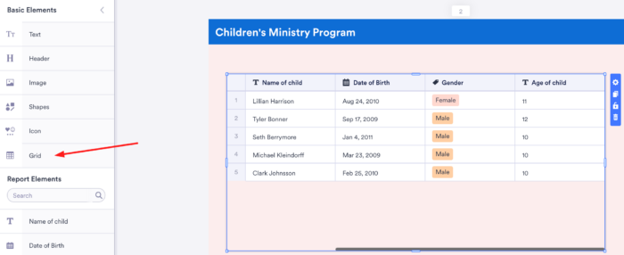The grid element in Jotform Report Builder displays form responses in a scrollable, spreadsheet-like format, turning your report into a dashboard that allows you and your team to quickly analyze all of your responses in an organized way, draw comparisons, and take action immediately.