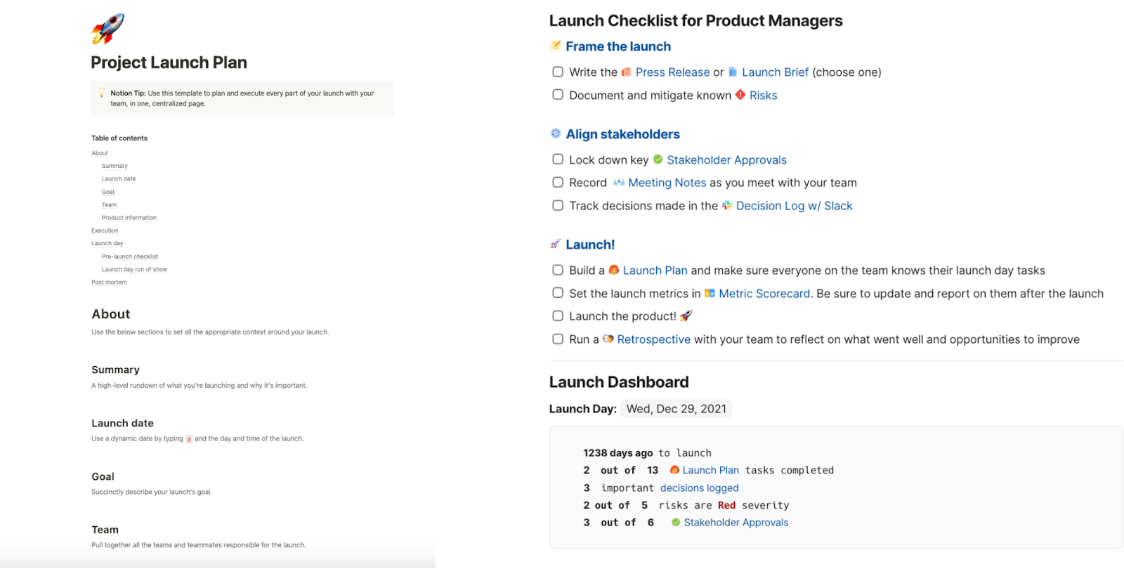 Notion (left) vs Coda (right) sample templates for a product launch.