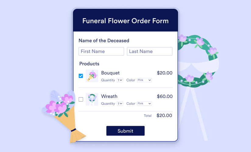 - Flower orders. Use digital flower order forms to help florists and families finalize the bouquets and other arrangements for the event.