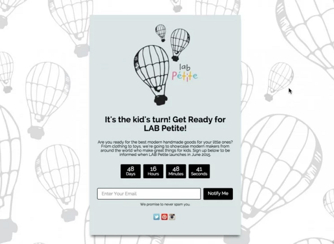 With its whimsical design, LAB Petite effortlessly includes many elements of a successful coming soon landing page. The page opens with a direct headline that tells a visitor the target audience is children and their parents. The copy succinctly explains precisely what is coming soon. A bold countdown shows visitors when, right down to the second.