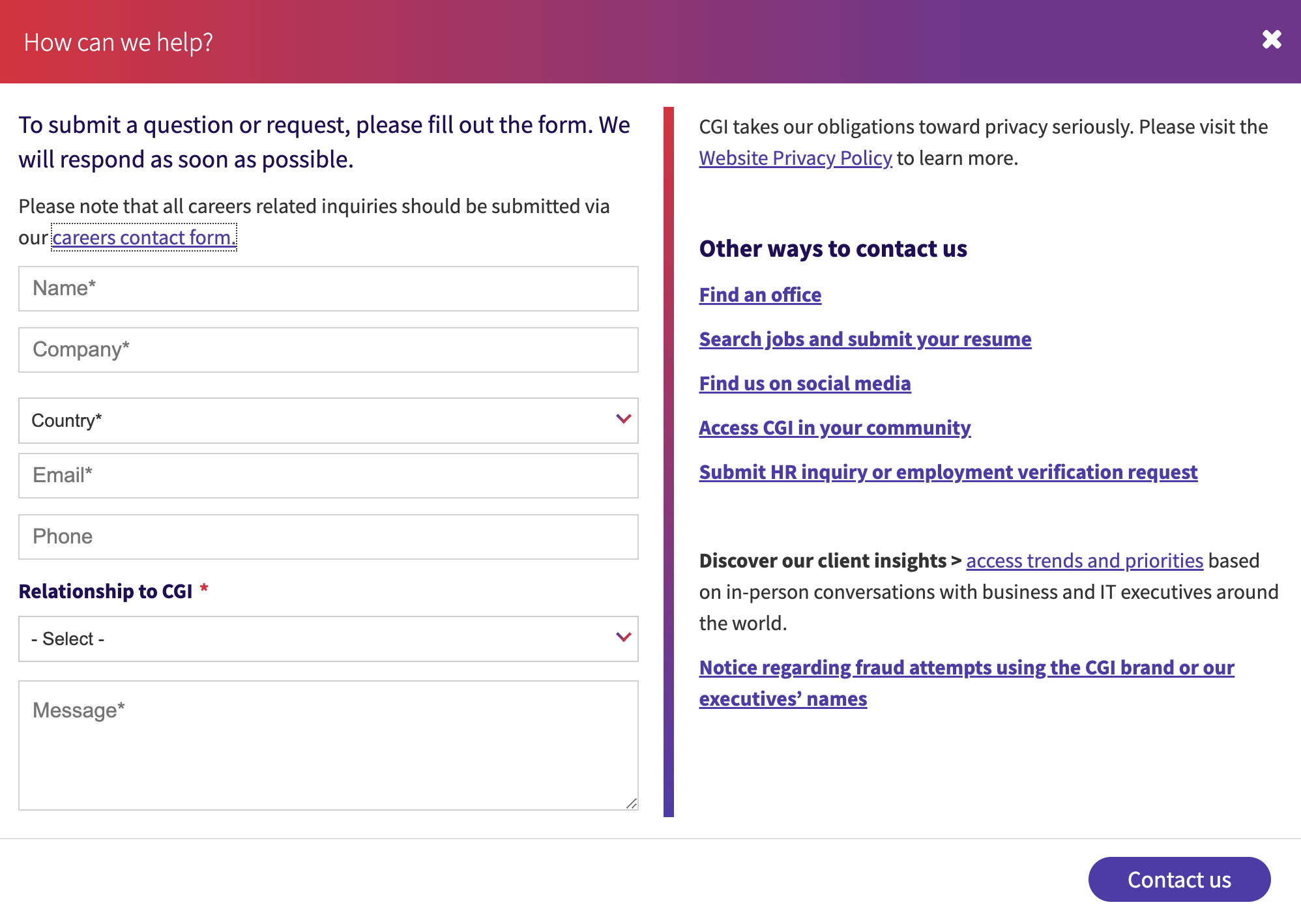 This is a well-designed popup form that includes a dropdown “Relationship to CGI” field (e.g. job seeker potential client, etc.) to help visitors specify what they’re looking for.