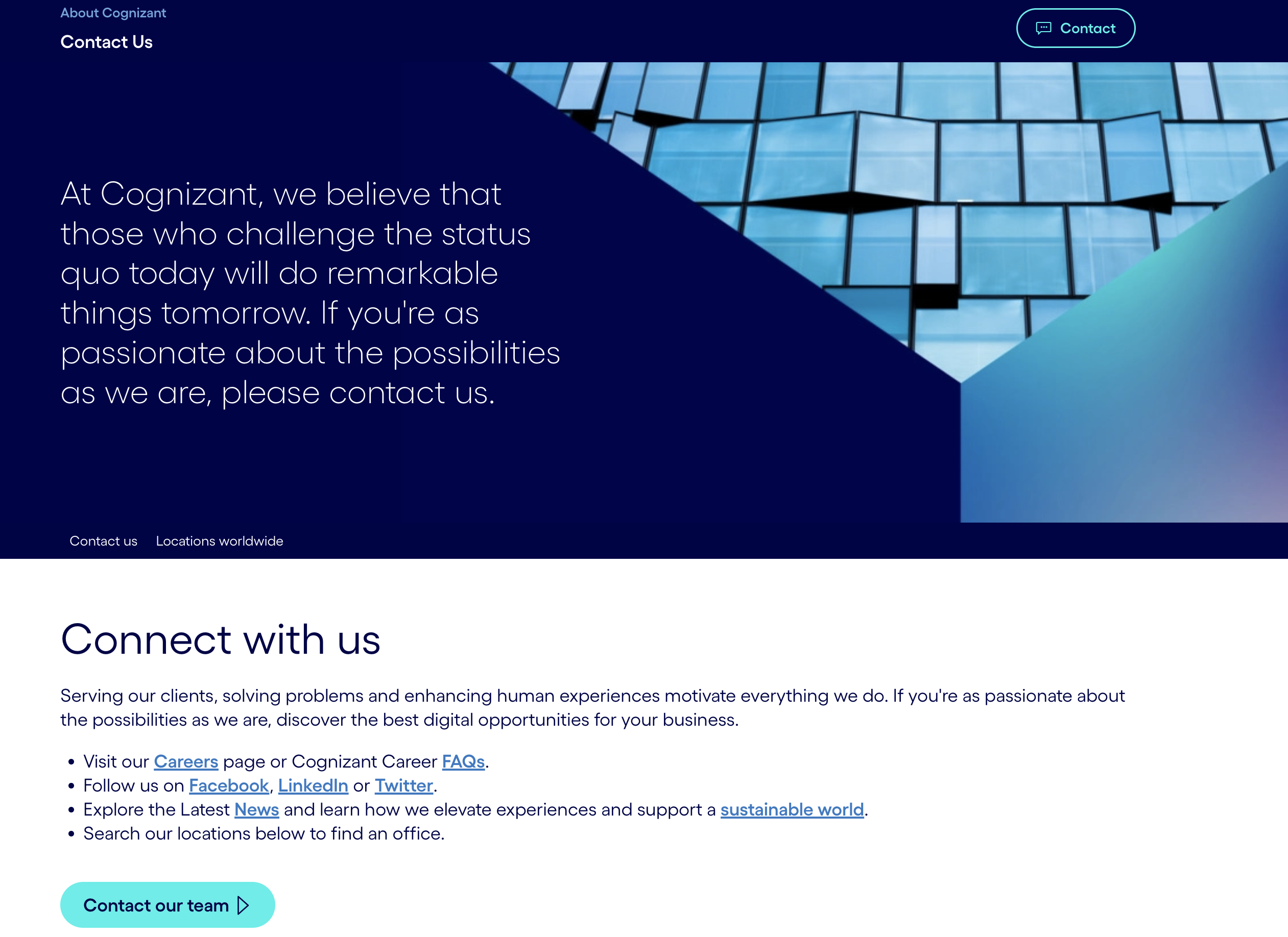 Cognizant’s “Contact Us” page is massive and loaded with links to pages for FAQs, career opportunities, the latest company news, and more. The company’s contact form includes a region field (North America, Europe, etc.), which makes sense for larger companies operating in different parts of the world.