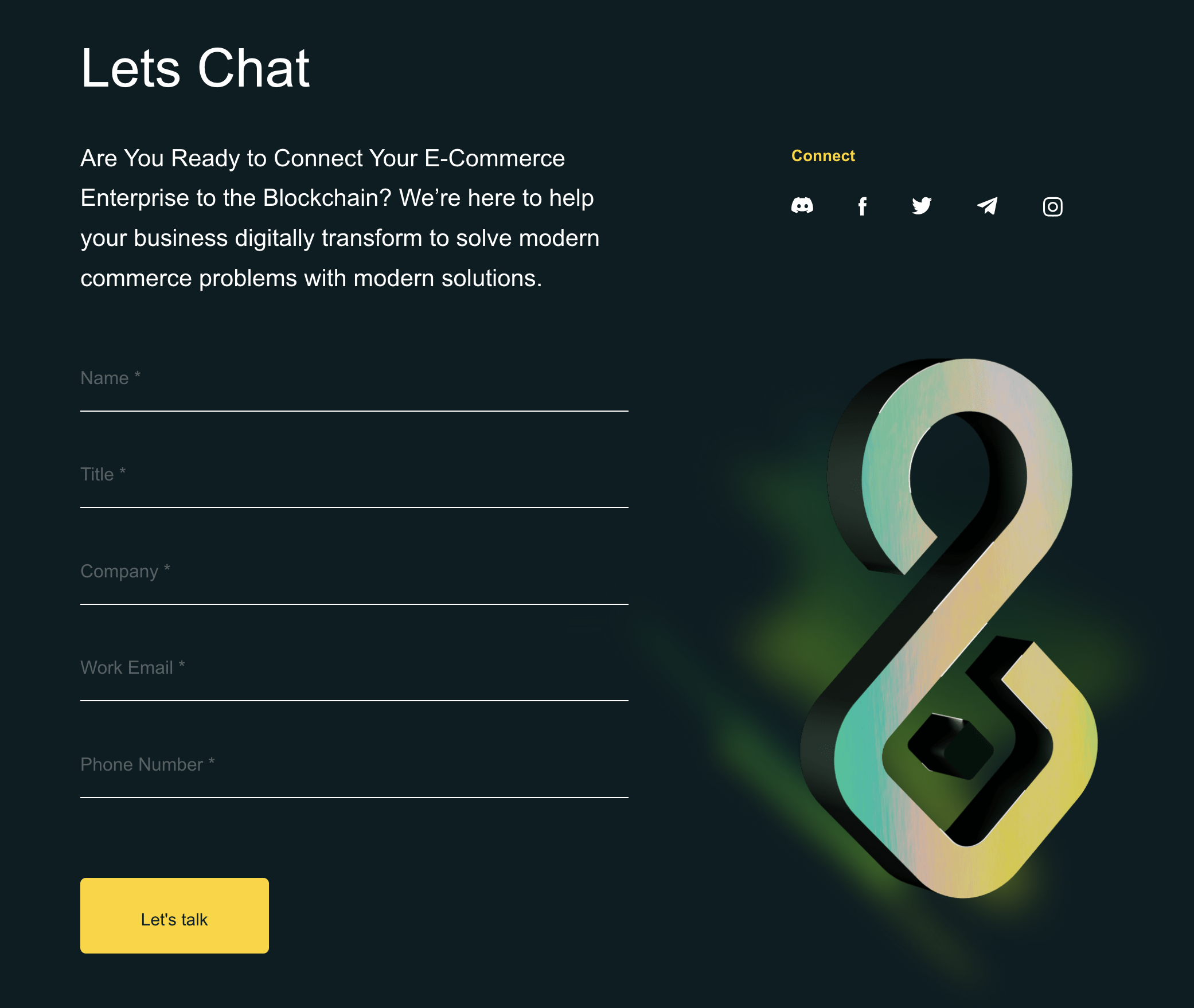This blockchain-focused company has a super-sleek contact page with animation, stylized text, and modern, minimalist social media icons.