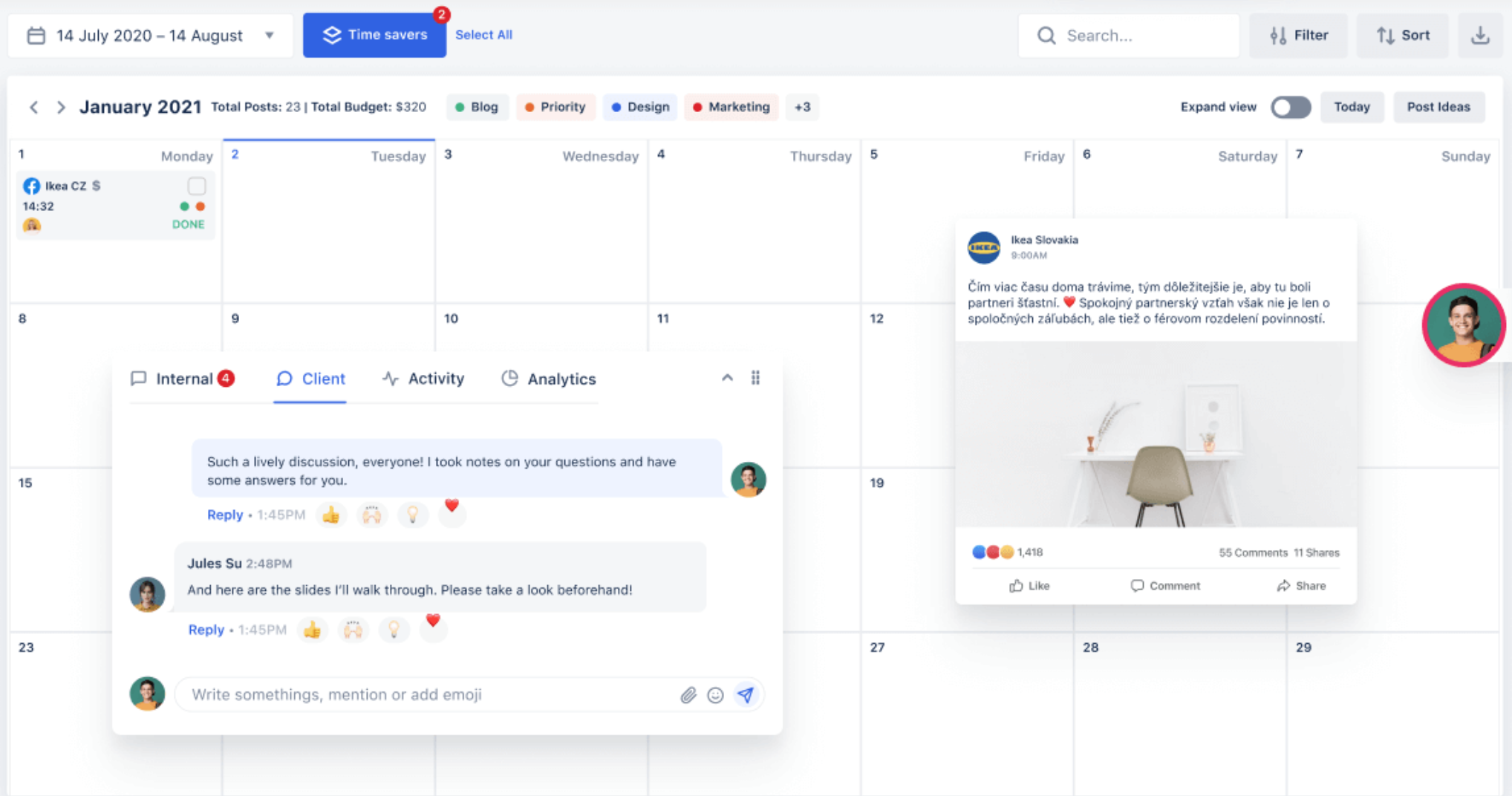 - Kontentino makes approvals and feedback clean: Clients and/or designers see what a post will look like, can comment, and request edits, all within the tool.