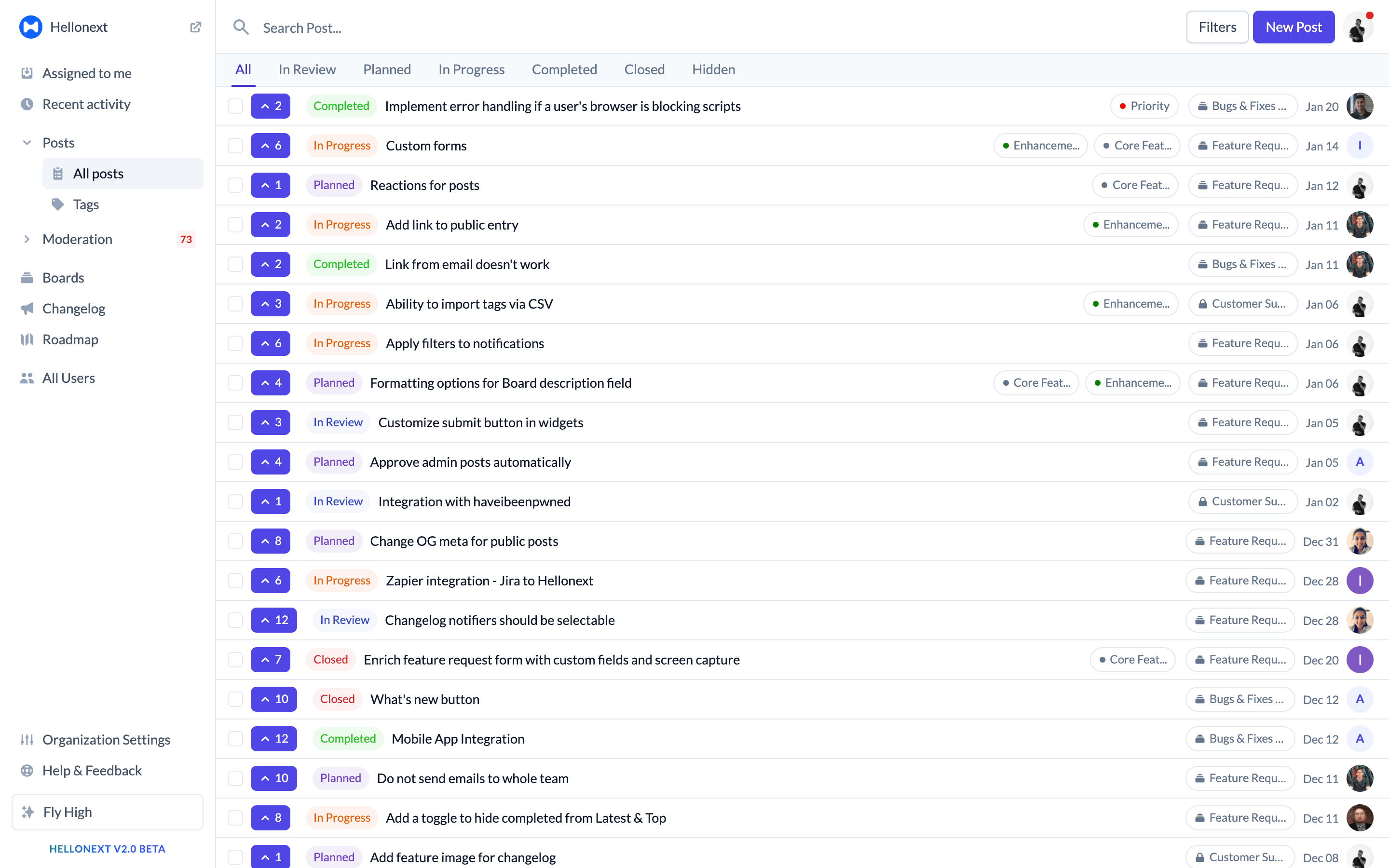- Key features: Collects customer ideas, feature requests, and bug reports through a branded portal; built-in public or private product roadmaps and changelogs; supports comments, upvoting, custom statuses, and role-based visibility